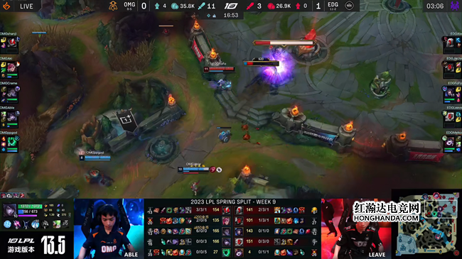 2023 LPL春季赛常规赛第九周第五日,EDG战队对阵OMG战队,目前位居LPL榜首的EDG战队无论是前期运营还是团战协作能力都非常顶尖,虽然在第二局因为前期劣势太大被OMG扳平比分,但EDG还是展现出强大统治力,通过稳健的团战发挥2-1战胜OMG,稳固了自己的榜首地位。