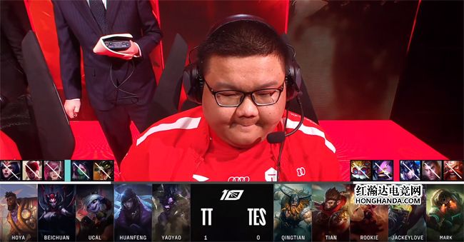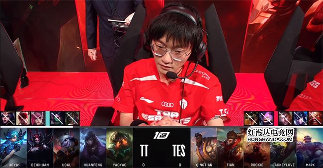 作为交换小炮单吃了下路一血塔,TES则抱团拆了中路一塔。中期小炮和安妮在下路互换阵亡,TES劝退了TT并控下风龙,不过TT上、中一直在边线单带,牵制着TES的节奏,两队抢中路线权时,小炮单吃了上路一塔。25分钟TT利用视野优势灵性rush掉大龙,TES晚来一步无力留人,随后尝试抓下路单带的格温,不料TT的支援迅速赶到,HOYA的格温直接开大一追五,把TES全员赶回高地上,TES三路二塔陆续告破,经济落后7千。最终TT故技重施开大龙逼团,安妮闪现下龙坑时蜘蛛光速飞天躲R,厄斐琉斯在正面斩获三杀,TT稳扎稳打1换5团灭TES一波结束比赛,1-0拔得头筹!