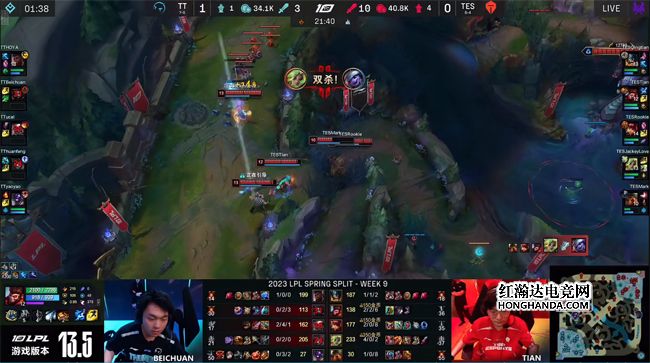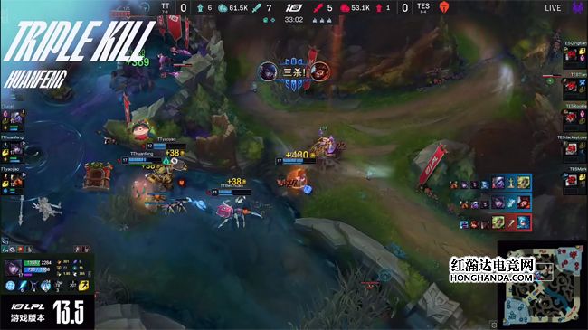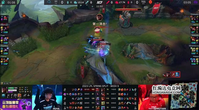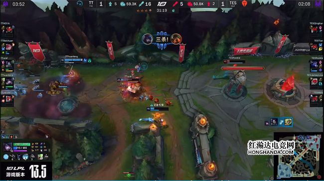 这一场TT背负着巨大的进攻压力,TES则稳健发育尽力避战。猴子gank上路时打出凯南的闪现,不过凯南的闪现转好之后TES还是选择放掉第二只先锋。TT急于推掉中路一塔,又把先锋放在中路牵制TES,回身抢占了小龙河道的位置。TES击杀了先锋之后抱团进小龙河道探视野,阿卡丽从侧翼切进TES后排,在吃到虚弱的情况下伤害依旧拉满,TT得以打出1换3并控下火龙在,作为交换TES推掉下路一血塔。大龙出生后TES在上路河道抓死了蕾欧娜,龙王拿到人头发育良好,双方经济持平。