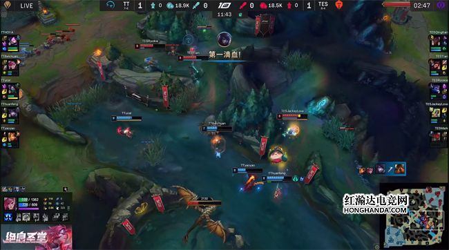 前期TES全力保障龙王的发育环境,虽然TT中、下两路没有线权,但抱团之后战力稳居上风,所以TES控下了水龙,作为交换TT拿到峡谷先锋,放在中路撞掉TES中一塔的镀层,让阿卡丽补发育。11分钟TT打小龙时被发现,TES中野和下路组各自为战,厄斐琉斯拿到泰坦的一血,TT心满意足地控下土龙。