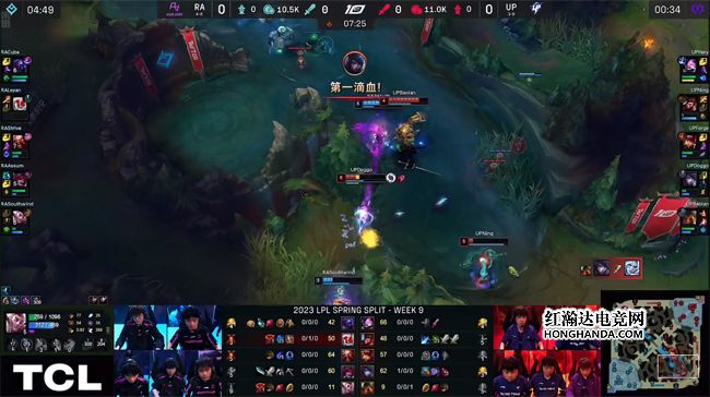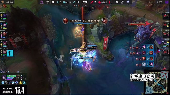 大龙出生前UP上、中路一塔失守,大树见RA众人出现在上路,灵性地放出第二只先锋通关了下路,不过UP的经济仍然落后3千。RA抢占了UP蓝buff野区和大龙坑的视野,果断rush掉刚刚“上班”的大龙,UP双传送落地赶来留人,打出1换3拆掉上路一塔,卡住RA进入小龙河道的位置,付出锤石一人的代价控下小龙,打断了RA的龙魂节奏。25分钟RA故技重施掌控了大龙河道的视野,rush掉大龙后同UP拉开了距离,酒桶绕后包夹炸回锤石,RA打出0换5团灭UP大获全胜!最终RA平推中路高地,打出1换5再次团灭UP一波结束比赛,2-0横扫UP终止六连败,保留着晋级季后赛的希望!