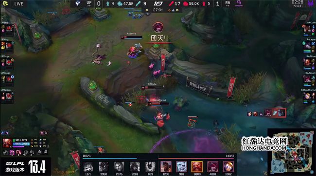 作为交换猴子击杀了峡谷先锋,霞洛组合见猴子出现在上路,果断越UP下路一塔强杀了厄斐琉斯并且全身而退。UP下路的劣势很快辐射到野区,RA中野辅抱团入侵UP下半野区时抓到了猴子,泰坦卖自己掩护猴子逃走。RA早早地控下第二条小龙,猴子只能把先锋放在上路养凯南。14分钟RA中野双游上路,三抓一越塔强杀了凯南,姗姗来迟的猴子开大收掉贾克斯,凯南复活之后单吃了上路一血塔。RA抓住猴子没有大招的时间差开打第二只先锋,霞大招接E闪斩获三杀,RA打出2换5团灭UP大获全胜!