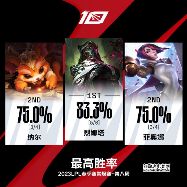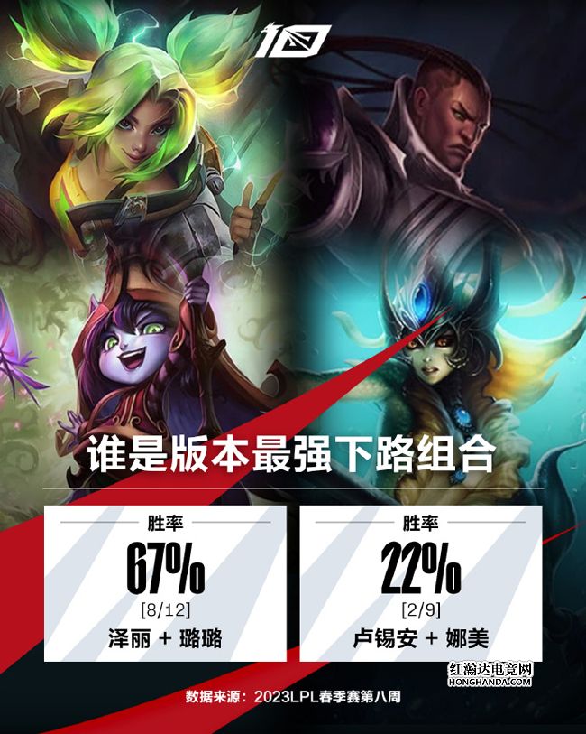 第八周祖安花火 泽丽&仙灵女巫 璐璐出场12次取得8场胜利,而“卢娜”组合圣枪游侠 卢锡安、唤潮鲛姬 娜美出场9次,仅获胜2场。