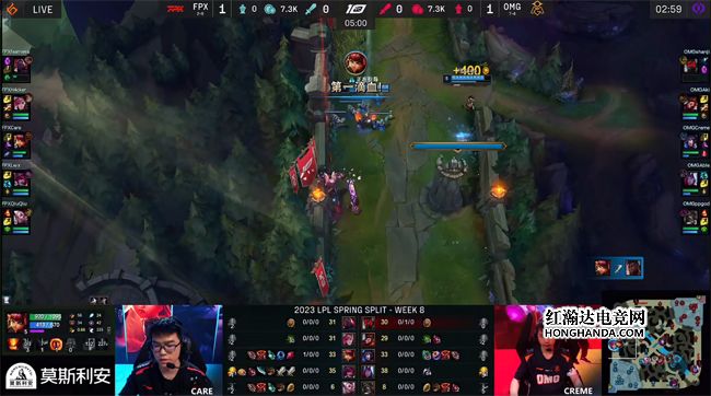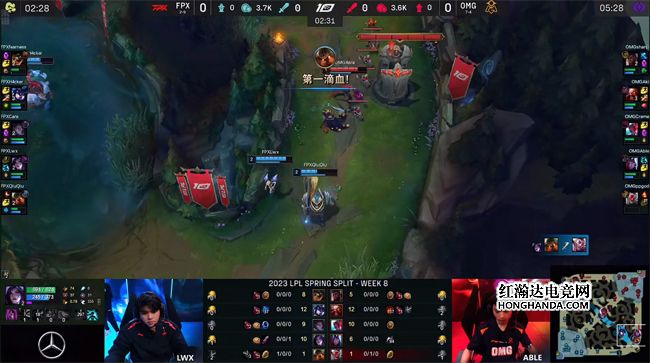 FPX中、下路一塔陆续告破,放出先锋推掉OMG中路一塔勉强止损,大龙出生前OMG领先3千。中期奎桑提单带拆了上路一塔,双方在中路试探性地互换了一波技能,泰坦先手钩中洛,减员的OMG选择放掉小龙,转而抱团rush大龙,FPX众人及时赶到,卡莎终结了韦鲁斯,FPX打出0换2准备接盘大龙,Aki的酒桶闪现下龙坑抢到大龙,粉碎了FPX的推塔节奏。30分钟OMG在中路强开猪妹,打出一波突如其来的0换4,通关了中路水晶并拿到第二条大龙。最终OMG平推上路高地,势如破竹打出0换5团灭FPX一波结束比赛,凭借技高一筹的找机会能力1-0先驰得点!