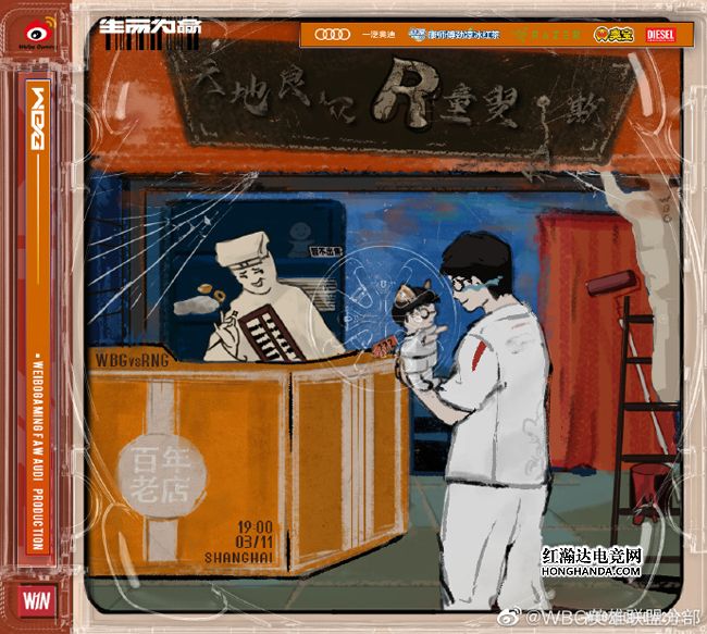 WBG的海报标题是“喂,你打错算盘啦!”WBG选手来到RNG开的“百年老店”,结果破败不堪的老店正在装修,墙角的蜘蛛网和歪歪扭扭的招牌都跟RNG百年老店的定位名不副实。WBG在上一场不敌EDG,目前积分7-4排名第6,还需要赢下两场才能稳进季后赛,不知道Xiaohu会和老东家碰撞出怎样的火花?