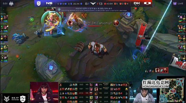 北京时间3月10日,LCK春季赛第八周第三天的第一场比赛由苦吞11连败排名垫底的NS直面排名第二的DK!两队的硬实力差距悬殊,最终DK凭借窒息的节奏2-0双杀NS豪取五连胜!