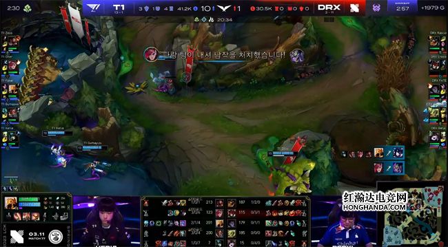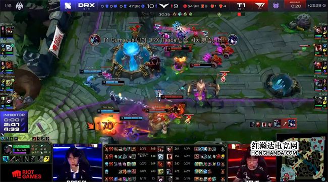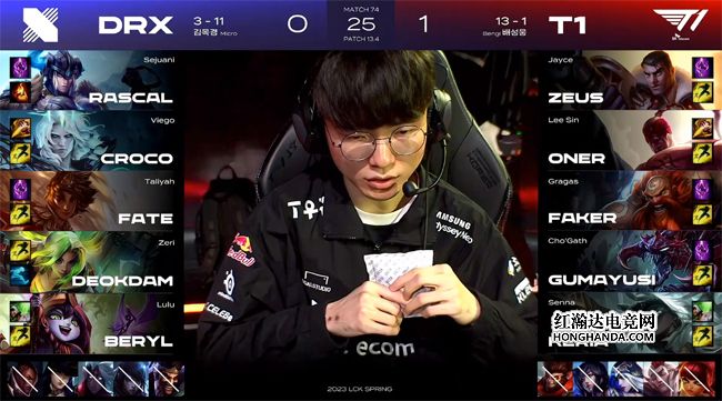 16分钟DRX付出下路一塔的代价,没有让T1捡第二只先锋之眼,T1则大举入侵DRX上半野区,打出0换3完全不亏,同时Zeus的纳尔还在下路单杀了Rascal的鳄鱼。大龙出生前DRX上路一塔告破,T1兵不血刃“听牌”了炼金龙魂,经济领先7千。中期T1明牌开大龙,DRX迫于三路兵线,只能由猪妹拼一手惩戒,T1先处理掉猪妹再稳稳地惩下大龙,失去了打野的DRX只能目送T1解锁龙魂!DRX经济落后1万6无力回天,最终T1平推中路高地,打出0换4一波结束比赛,稳扎稳打1-0先下一城!