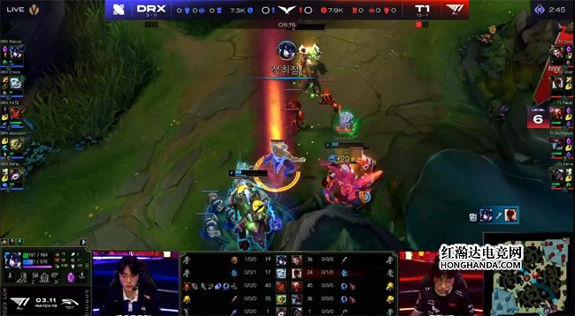 这一场T1不但选出了“科研”阵容,而且全员还联动了一波,打出岩雀的闪现。前期佛耶戈选择“军训”杰斯,DRX上野的伤害更高,猪妹拿到盲僧的一血,杰斯自知难无法脱身,果断硬换了佛耶戈,猪妹拿到双杀成功止损。
