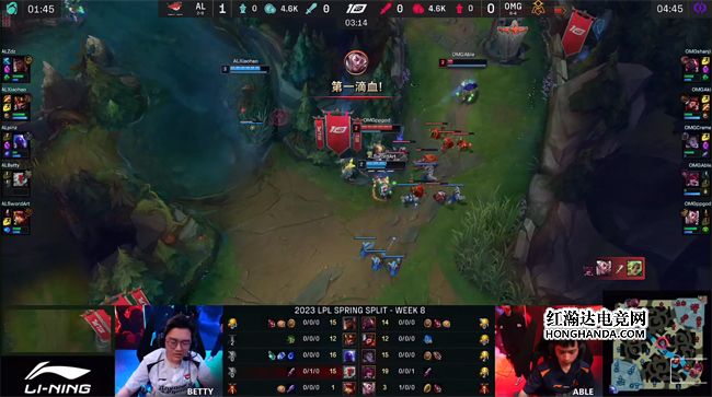 “卢娜”组合的技能真空期为一血埋下了伏笔:AL抓住卢锡安没有净化,加上娜美闪现还没有转好的时机,中野双游下路越塔四包二得手,娜美无奈送出一血。猴子把先锋放在上路,不过兰博没有吃到镀层。AL继续在下半张地图做文章,抢先落位小龙河道,阵型分散的OMG遭到瑟提的先手强开,AL打出1换2控下水龙,推掉OMG下路一血塔节奏起势,猴子拿到第二只先锋作为止损。大龙出生前娜美和大树在上路河道互换倒地,AL上、中路一塔告破,双方经济持平。