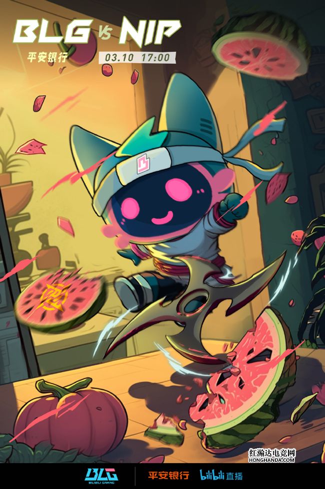BLG的海报标题为“切”,BLG的吉祥物布噜噜玩起了经典的“水果忍者”游戏,用NIP忍者的飞镖切碎了标有NIP队标LOGO的西瓜。BLG积分6-5排名第9,堪堪处在晋级季后赛的门槛上,今天对上排名靠后又进行了人员变动的NIP,这一分志在必得。