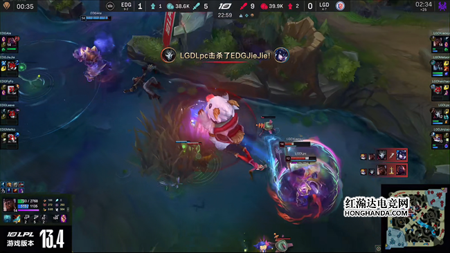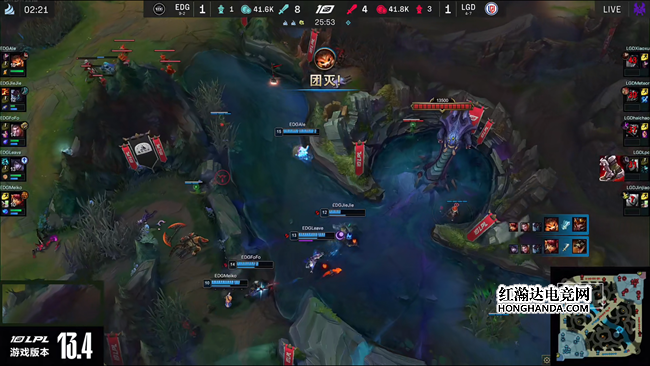 大树在下路发起Gank闪现协助队友拿到了艾希人头,不久后又在上路抓死了赛恩,EDG继续前期试图控制资源,但第一条小龙已经落入LGD之手,接下来双方下路在河道对拼打成1换1,LGD又在小龙团击杀了沙皇,EDG前期节奏陷入全面被动,只能收缩防线保持发育,找到一些破绽击杀了杰斯与大头,逐渐稳住了局势。22分钟左右EDG故技重施突然先手击杀了大树,随后利用人数优势直接开打大龙,LGD四人虽然无法抢掉大龙,但发育良好的奎桑提冲入人群如同天神下凡一打三斩获三杀,带领LGD在四打五的情况下团灭了EDG!