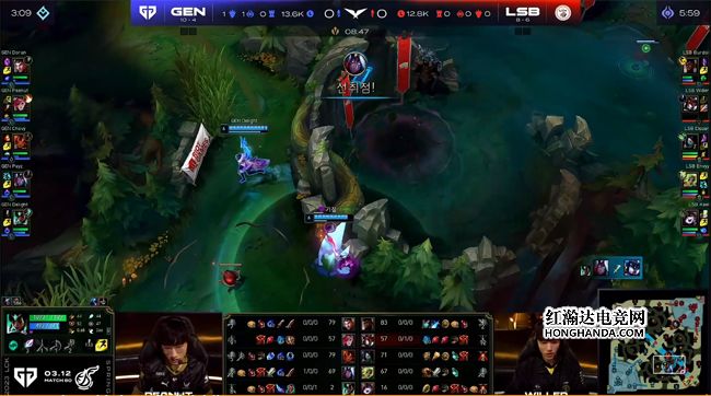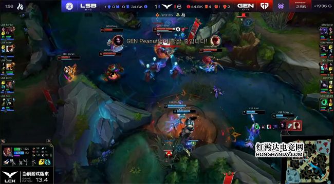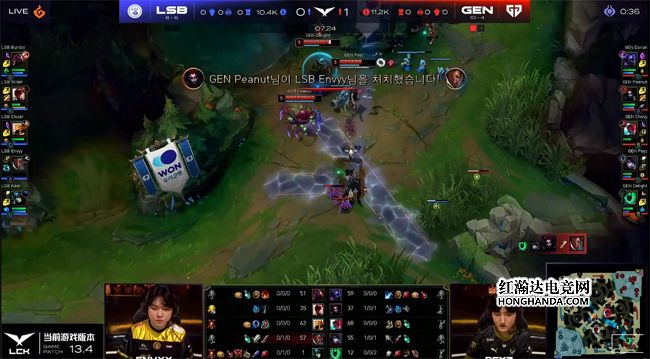 Peanut的蜘蛛也不甘示弱,前期对下路重拳出击,连抓了两波下路,先后击杀娜美和卢锡安,厄斐琉斯拿到一血加3层塔皮,LSB的“卢娜”组合没能打开局面,盲僧只能控下火龙进行止损。Chovy的永恩清完兵线游走到上路,帮贾克斯越塔强杀了赛恩,GEN得以拿到峡谷先锋。LSB两条边线的劣势越来越大,厄斐琉斯在队友的掩护下单吃了LSB下路一血塔,蜘蛛也放出先锋撞掉LSB上路一塔,帮永恩击杀了撤退不及的沙皇。大龙出生前LSB抱团推进中路,GEN劝退了LSB反破中路一塔,经济领先7千。