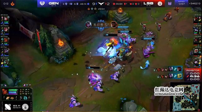 中期LSB一直抱团尝试抓单,卢锡安在大龙河道扫了一波大招,可是厄斐琉斯点锤石的灯笼扬长而去。GEN看到LSB想推中路一塔,灵性地放出第二只先锋通关了上路。LSB处处受制节奏哑火,无奈目送GEN控下风龙。23分钟双方在中路互换了一波技能,GEN回身直接开大龙逼团,盲僧Q进龙坑直接“白给”,GEN各个击破打出0换4大获全胜!LSB三路水晶陆续失守,经济落后再次超过了1万。最终GEN平推上路高地,打出0换5团灭LSB一波结束比赛,2-0送给LSB三连败!