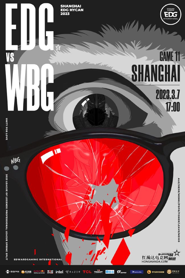 EDG的海报标题为“寒锋出鞘,眼花缭乱!”从WBG选手的瞳孔中反射出的人影正是代表EDG的骑士,骑士仅靠剑气就击碎了WBG选手戴着的墨镜镜片,EDG的获胜决心可见一斑。EDG近期解锁了三连胜暂居榜首,只要今天拿下WBG将锁定季后赛席位!