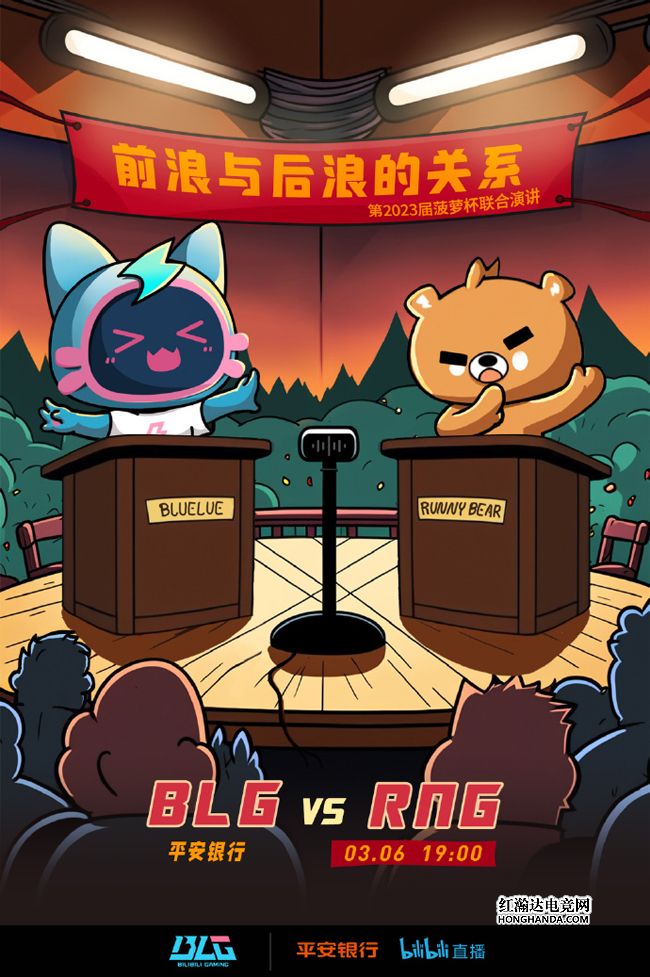 BLG的海报标题为“讲”,两队吉祥物布噜噜和软泥熊正在就“前浪与后浪的关系”展开联合演讲~上一场比赛BLG爆冷惨遭LGD让一追二,近期状态起伏很大,团队指挥混乱、执行力不高都是困扰着BLG的问题,不知道今晚BLG能否证明自己的实力?