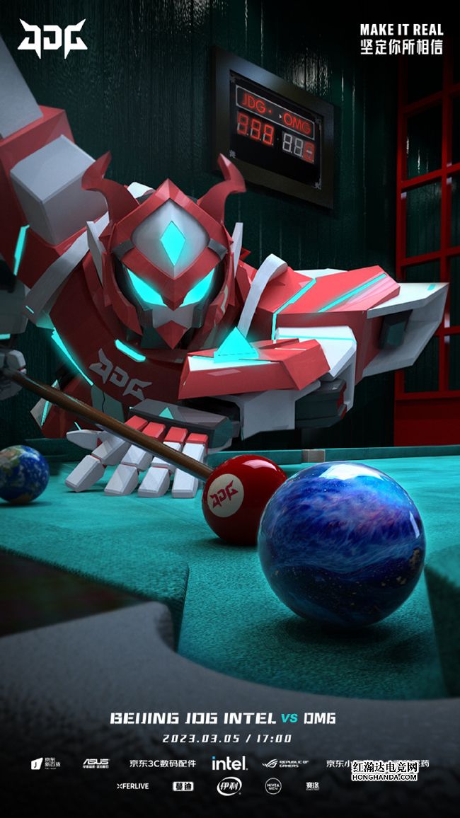JDG的海报标题为“争分”,机甲武士准备在台球桌上打出制胜一球,将代表OMG的“浩渺星海球”打入袋中,机甲武士的碎碎念心理活动拉满:“掌握角度,保持力度,会心一击!Miss?不可能,必中!竭尽全力,争夺每一分!”
