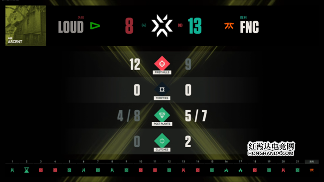 下半场LOUD作为防守方主动从中路前压偷掉了Derk,削弱了FNC进攻的火力,随后成功回防B点拿下手枪局,再利用枪械优势拿到第二局。长枪局的FNC意外被cauanzin穿死两人,同时aspas极限跳过零的绊线史诗级绕后,LOUD拿下三连胜,迫使FNC交出暂停寻求改变。暂停回来以后FNC主攻A点,结果被二楼的Less打出神级四连杀再度败北,局势彻底倒向了LOUD。FNC竭力扳回一分,但LOUD的开局布置以及选手状态都已出神入化,继续压制FNC拿到了赛点。FNC在最后时刻连扳两分,但奈何LOUD领先赛点太多,交出最后一个暂停稍作调整以后一鼓作气拿下了比赛,LOUD以13:9赢下图三,总比分1:2落后FNC。