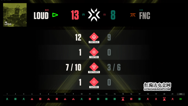 攻防交换以后FNC重新掌握了主动,开场六局拿到五分,彻底打蒙了LOUD,LOUD无法摸透FNC的防守体系,被FNC凶猛的回防冲乱步伐,心态和决策都变得不稳,FNC摧枯拉朽再拿一分,直接12:7拿到赛点,LOUD在下半场仅仅拿到了一分。在危机关头LOUD如同无头苍蝇在AB点反复犹豫最终进攻B点,Chronicle再次贡献精彩拉枪连杀带领Fnatic以13:7拿下第二张地图,Fnatic战队2-0手握冠军点!卫冕世界冠军LOUD站到了悬崖边缘。