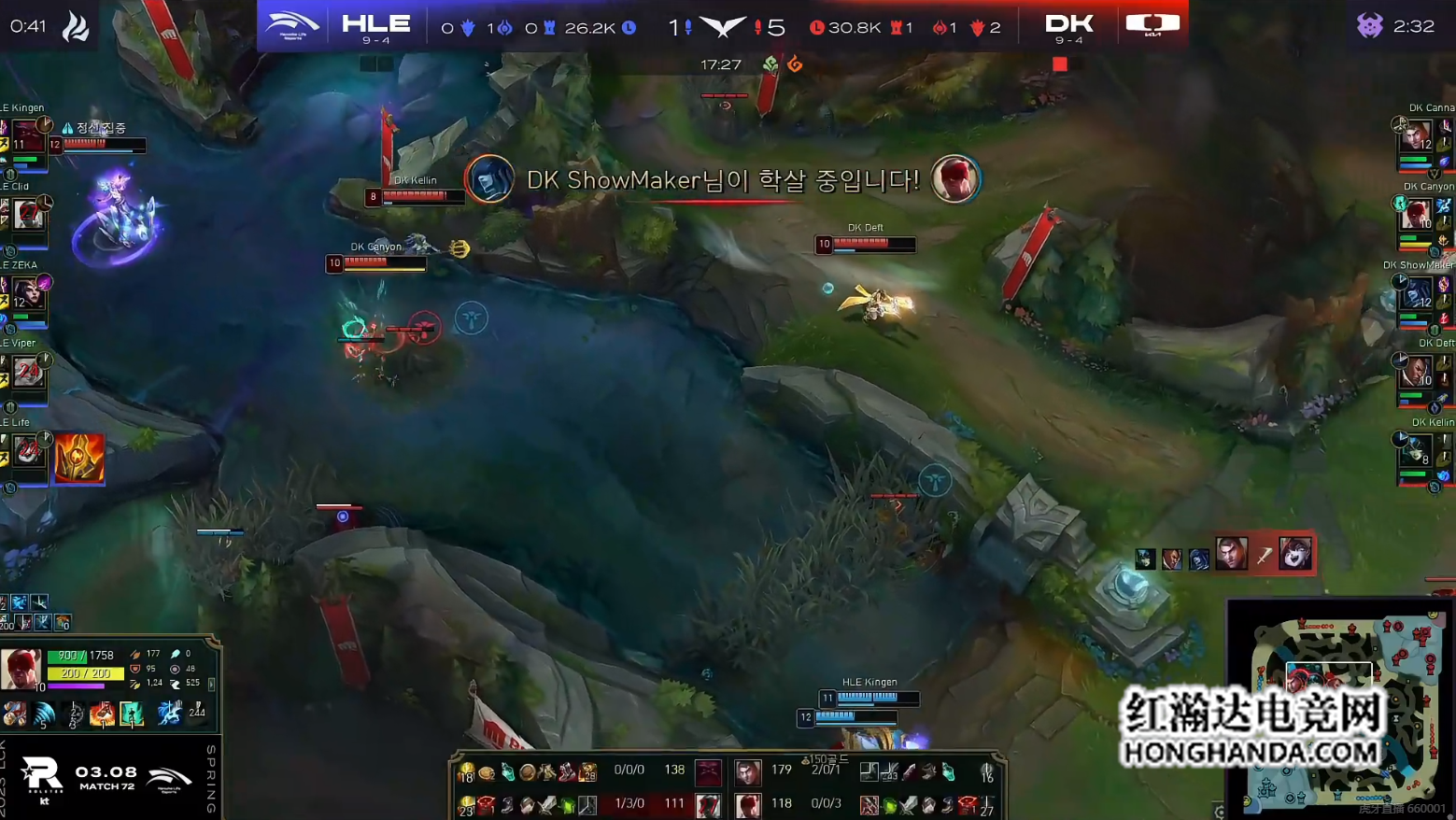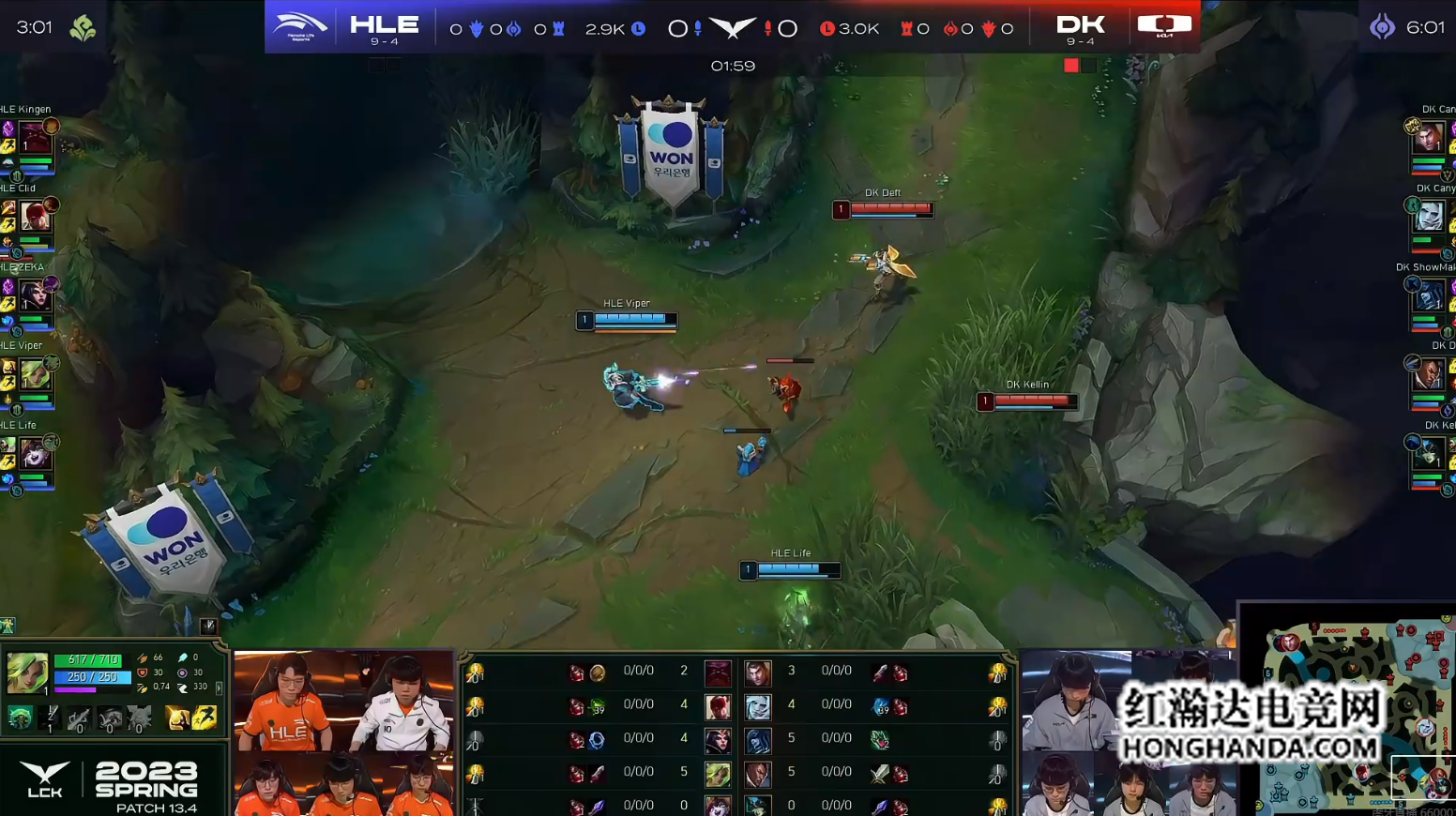 比赛中期DK控下了三条小龙,并且在第二条峡谷先锋的时候,DK抓住HLE的失误,击杀HLE三人并拿下峡谷先锋,DK手握优势胜算非常的大。HLE这边只能拖双C的发育,以及上路奥恩坦起来。