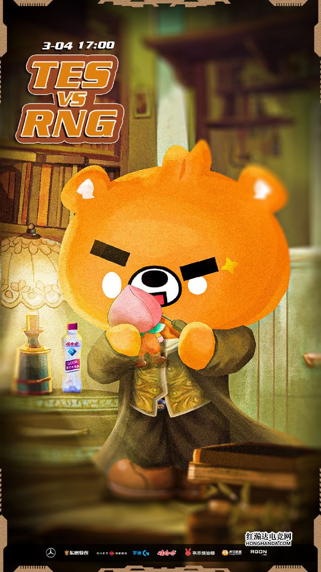 RNG的海报标题是“让我拆开看一看!”软泥熊拿着螺丝刀拆解水蜜桃玩偶,准备好好研究一下TES的弱点。RNG由于迷之轮换中单,惨遭LGD让一追二。今天的首发中单自然是发挥更为稳定的Angel,期待他和Rookie的中路斗法!