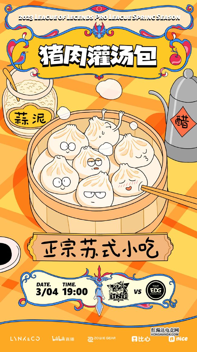 LNG的海报标题为“猪肉灌汤包”,LNG积分8-1稳居榜首,近期豪取四连胜状态火热,中野Scout、Tarzan是目前这支LNG的核心,但对上强敌拼的就是短板,对于Zika、LP、Hang这三位年轻小将而言,今晚无疑是一场严峻的考验,大家觉得EDG能否撼动LNG的头名宝座呢?