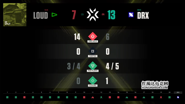 下半场双方攻守互换,LOUD终于找回了他们擅长的比赛节奏,拿下手枪局以后aspas在第二局凭借一杆飞将1打4砍下四杀!LOUD渐入佳境拿到三分以后,DRX稳住优势继续通过战术转换创造机会,尽管Less一度贡献1打5击杀三人的局面,但DRX还是如愿以12:6拿到赛点。LOUD经过2v2惊险守住赛点,但DRX随后用出芮娜和蝰蛇的大招,终于13:7拿下第三张地图的胜利,将总比分扳为1:2。