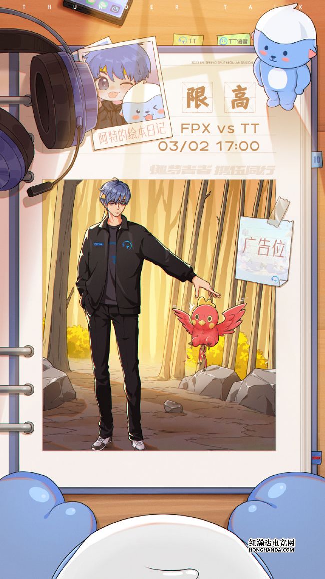 TT的海报标题是“限高”,代表TT的大长腿蓝发少年用手掌封住了FPX吉祥物小火鸡的起飞路线,致使小火鸡无法飞到高空中。TT在上一场0-2不敌RNG,其中第一局的时空回溯更是直接影响了TT选手们的心态,希望他们今天能打出自己最好的水平。