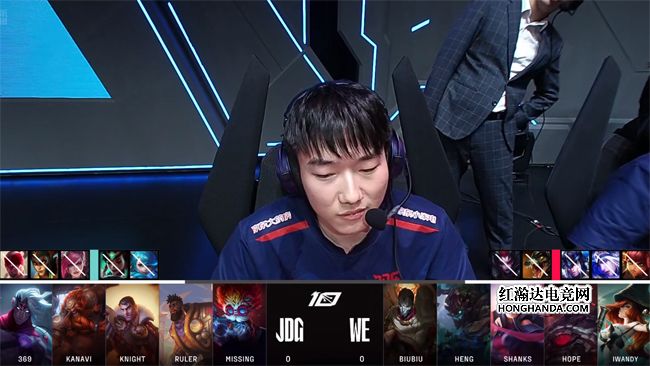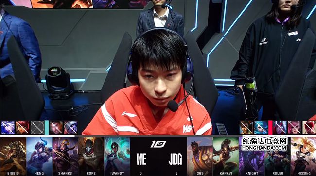 开局JDG下野相当强势:Kanavi的酒桶反了WE的蓝buff,以双河道迅捷蟹加三buff起手,同时MISSING的大发明家抓住了昔日老队友Hope的破绽,先手E技能命中烬,韦鲁斯补伤害帮助大发明家收下双杀,JDG下路对线打出0换2梦幻起飞~