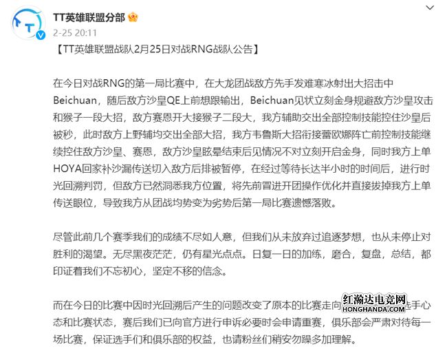 当天这场比赛由于该问题被迫暂停20多分钟,对双方选手的心态和手感都造成了一定影响,尤其是没有这种暂停经历的TT在第一局比赛结束后没能及时找回状态,第二局毫无招架之力节节败退,最终0-2负于RNG。赛后TT英雄联盟分部官博发公告称已向官方申诉,必要时会申请重赛。目前官方还在调查,希望可以早日公布真相。