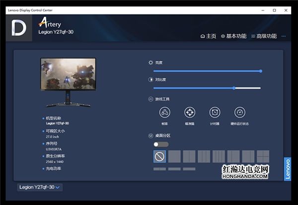 Y27q(240Hz)还搭载了联想专用的Artery (Lenovo Display Control Center) 驱动软件,它可以帮助玩家快速调节显示器设置,而且不需要实体按键操作,所以使用更加方便简单。它不仅可以调节显示参数还可以调整信接口和供电,不仅如此,用户还可以保存和预设各种游戏设置,并选择根据游戏类型随意切换,让每款游戏都找到自己最合适的“游戏视界”。