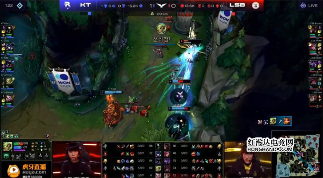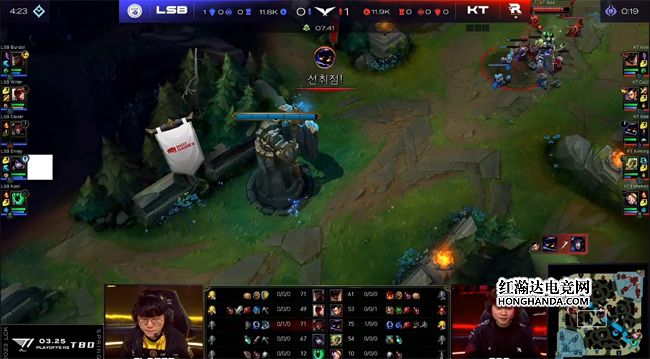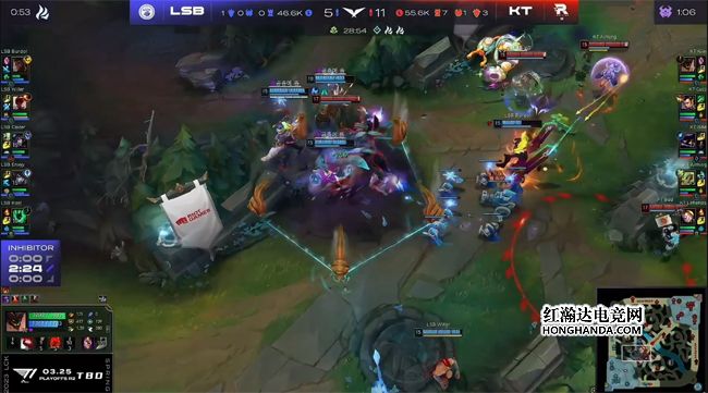 站在悬崖边上的LSB继续选择保下路的战术,厄锤组合也是前期LSB三路唯一手握线权优势的。KT对此心知肚明,一直对下路施压:赵信3级直接gank下路,打出锤石的闪现,随后洛和厄斐琉斯互换了闪现。LSB本应利用下路的线权优势控下小龙,不料Kiin的石头人放弃了兵线,走到下路支援队友,KT全员集结控下海克斯小龙。