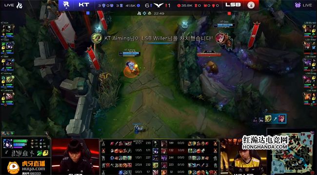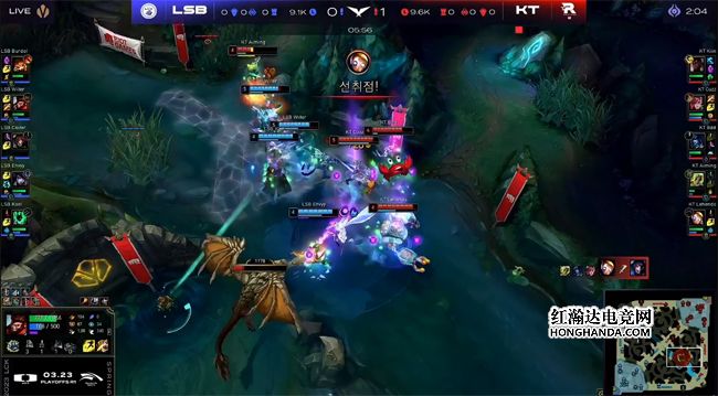 开局猴子从上往下刷,所以纳尔选择放线,在塔下稳健吃兵,丽桑卓在中路压制了阿狸,LSB只有下路手握线权。5分钟厄锤组合掩护猴子开小龙,双方中野及下路爆发了一波四打四,阿狸先手闪现魅惑到蔚,机器人趁机钩回阿狸拿到一血,KT付出泽丽一人的代价击杀了LSB双C,还接盘了土龙梦幻起飞~