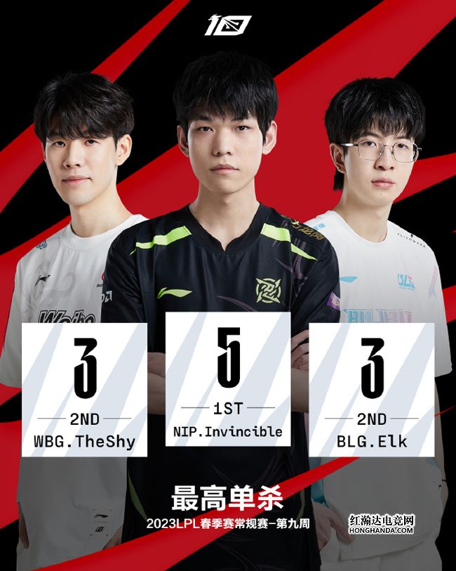 2023LPL春季赛常规赛只剩不到一周的赛程,英雄联盟赛事数据官博近日统计了第九周的趣味数据:NIP上单Invincible以五次单杀位列单杀榜第一;RNG下路GALA打出最高场均15分钟经济差1918.5;血腥程度最高的是RNG战队。
