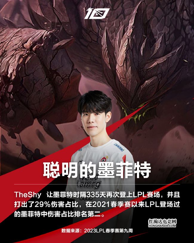 WBG上单TheShy让熔岩巨兽 墨菲特时隔335天回归LPL,并且打出了29%的伤害占比,在2021LPL春季赛以来的墨菲特中伤害占比排名第二。