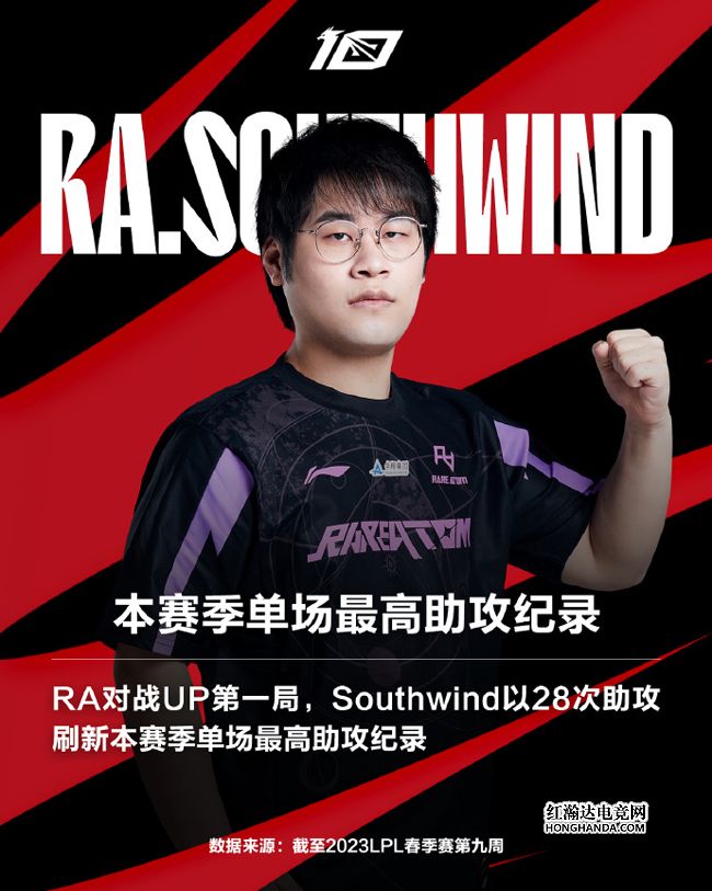 本赛季单场最高助攻纪录刷新:RA对战UP第一局,RA辅助SouthWind打出28次助攻。