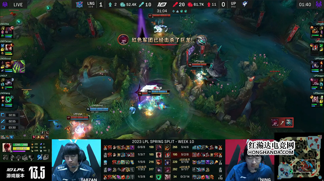 2023 LPL春季赛常规赛第十周第三日,LNG战队对阵UP战队,如果这场获胜,他们就将锁定至少常规赛前三的席位,第一局LNG通过稳健的运营轻松取胜,第二局UP则利用前期先锋团的胜利滚起雪球,顽强扳平比分。最终决胜局里UP由于中野在前期的失误最终葬送了比赛,LNG成功捍卫主场带走胜利。