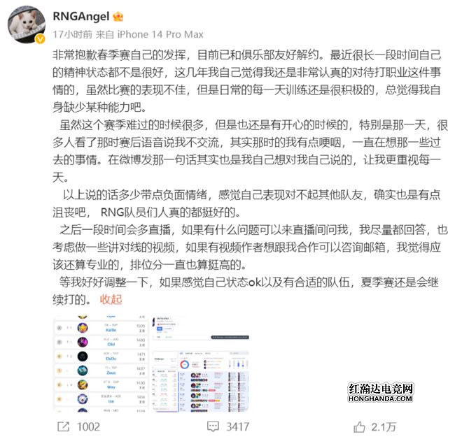Angel:非常抱歉春季赛自己的发挥,目前已和俱乐部友好解约。最近很长一段时间自己的精神状态都不是很好,这几年我自己觉得我还是非常认真的对待打职业这件事情的,虽然比赛的表现不佳,但是日常的每一天训练还是很积极的,总觉得我自身缺少某种能力吧。