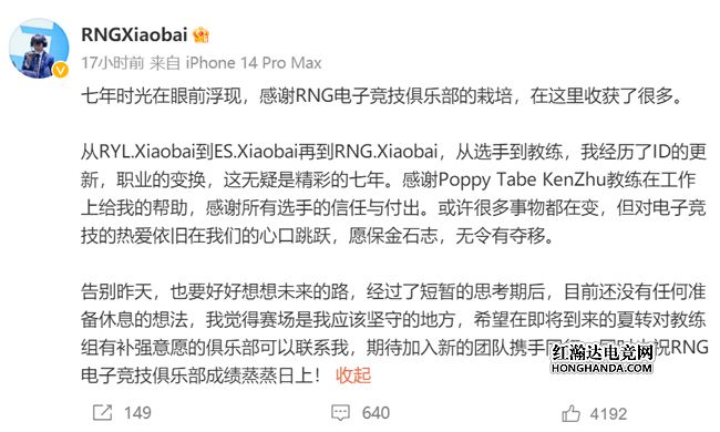 从RYL.Xiaobai到ES.Xiaobai再到RNG.Xiaobai,从选手到教练,我经历了ID的更新,职业的变换,这无疑是精彩的七年。感谢Poppy Tabe KenZhu教练在工作上给我的帮助,感谢所有选手的信任与付出。或许很多事物都在变,但对电子竞技的热爱依旧在我们的心口跳跃,愿保金石志,无令有夺移。