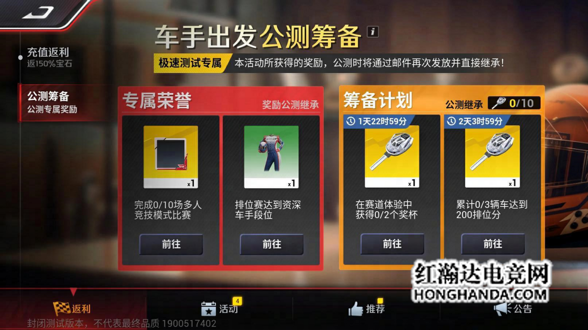 极速测试限定福利活动——“车手出发,公测筹备”将同时开启。在游戏测试期间,玩家只需完成对局、参与排位等活跃任务,积累对应活跃值,即可在活动页面中领取限定头像框、赛车服和十连抽等豪华大礼!