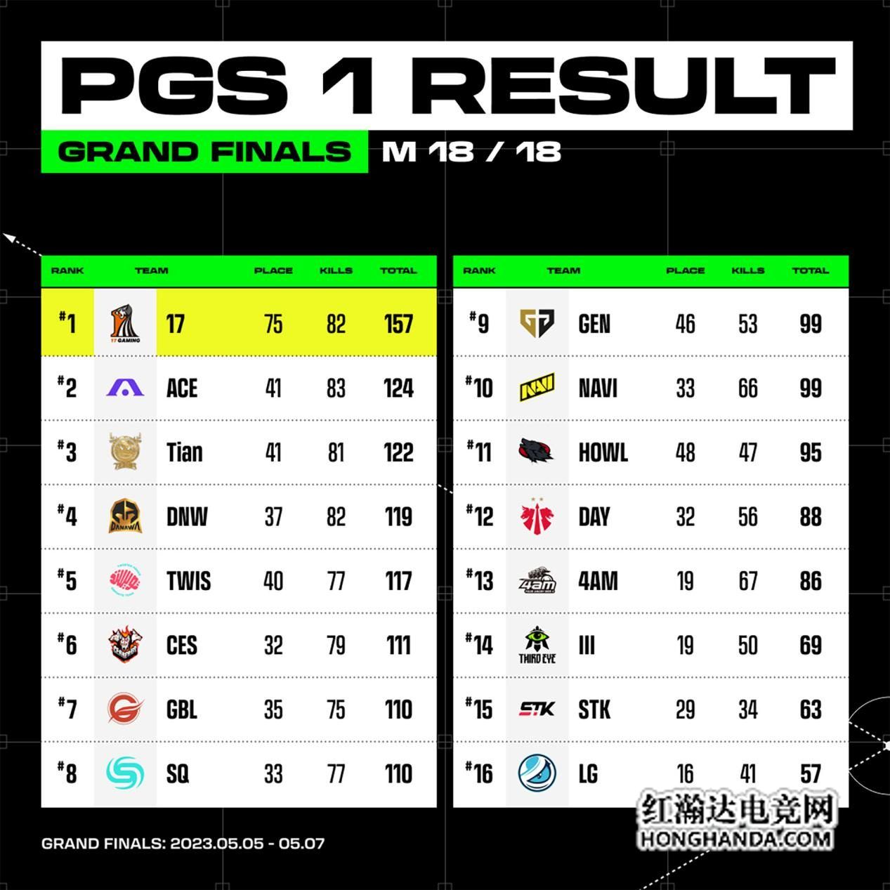 PGS 1的总决赛于5月5日至7日在位于马来西亚吉隆坡的战斗竞技场举行,是一场线下赛事比赛。经过三天18场比赛的激烈角逐,由"Lilghost"、 "Xbei"、"xwudd" 和"SuJiu" 组成的中国全球合作伙伴17Gaming战队以157的总分成为第一个PGS冠军,赢得了该项荣耀。