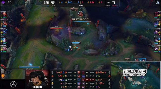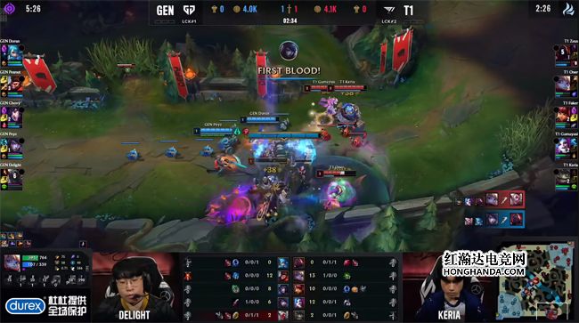 开局3分钟双方中野及下路组为了小龙河道的迅捷蟹大打出手,机器人先手Q钩回塔姆,龙王阻隔了T1中野,GEN帮助金克丝拿到机器人的一血,塔姆闪现W逼出厄斐琉斯的闪现。