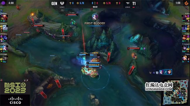 开局阿狸在中路激进压制,用蓝量换了丽桑卓的血量。丽桑卓摇来猴子gank,阿狸压线过深选择反向逃进GEN的上半野区,酒桶交闪现绕后包夹,阿狸见逃跑无望放弃交闪现,被猴子拿到一血。