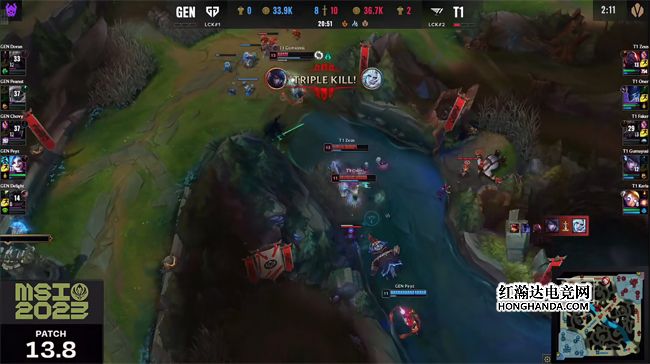 中期T1进入自己最为擅长的分带拉扯领域,GEN进入大龙河道做视野,迫使T1赶来回防大龙。Oner的兰博完美大招烤到GEN全员,也起到了绝佳的劝退效果。GEN退到中路没有回城补状态,而是冒进地选择先手强开霞,Gumayusi的霞光速大招规避了GEN的控制,倒钩伤害拉满秒掉波比。Faker的奎桑提开大带走了厄斐琉斯,并且成功将其终结!T1反打出一波突如其来的0换4,平推中路一波结束比赛,有惊无险3-2击败GEN晋级胜者组决赛!