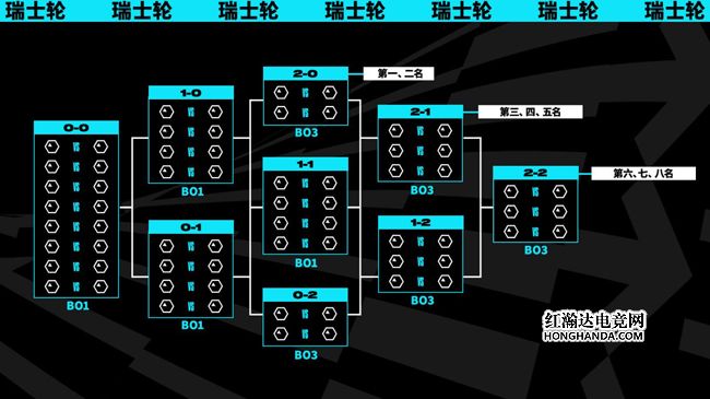 在第一轮,每支队伍都会与不同赛区的对手随机配对,进行一轮单场胜负赛。这一轮比赛将产生8支1胜0负的队伍与8支0胜1负的队伍。第二轮又将进行8场单场胜负赛——8支1胜0负的队伍之间进行4场比赛,8支0胜1负的队伍之间也进行4场比赛。