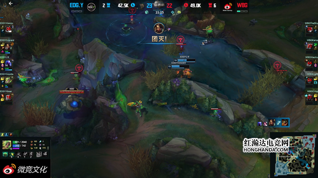 WBG在取得优势以后立刻提速发起猛攻,连续不断的攻势压迫的EDGY喘不过气来,连续在小团战里损兵折将连连溃退,WBG高歌猛进连破两路高地,转眼间带着大龙Buff发起了最终攻势,EDGY队员背靠基地绝望发起反击,但是WBG不给任何机会轻松击溃了对手,恭喜WBG 3-0横扫EDGY,成功挺进微博杯决赛!