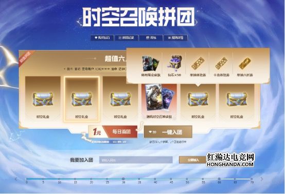 值得一提的是,此次“时空召唤”还准备了“时空拼团”玩法,首次入团和每日首次开团只需要1块钱,6人成团后必有一人获得时空召唤奖池的随机皮肤,而团内其他人也会获得时空礼盒,开启后有机会领取钻石、折扣券、十连体验券等奖励。