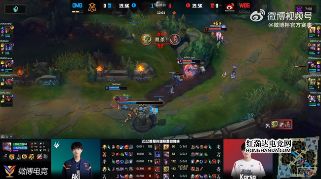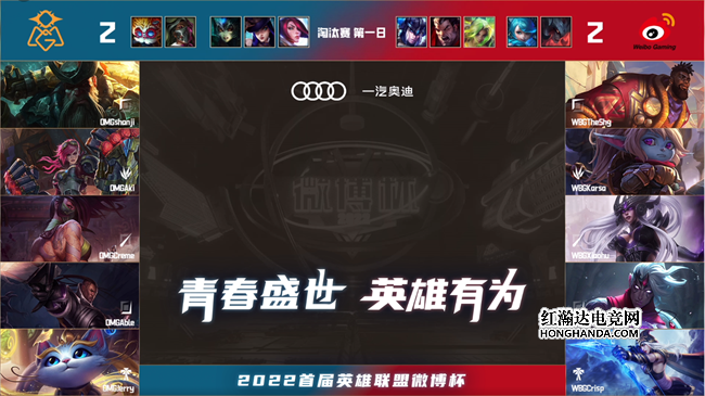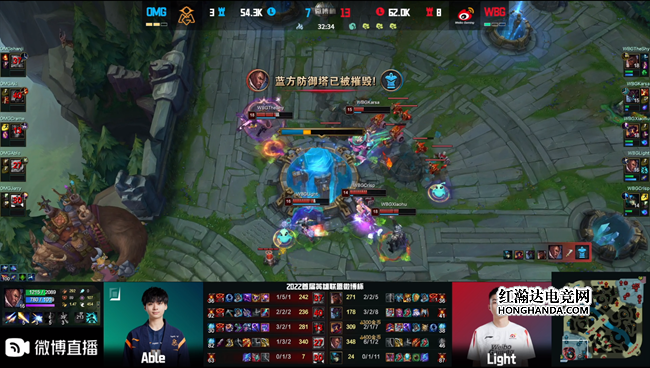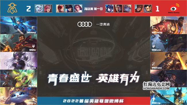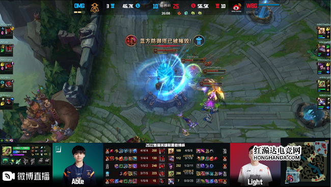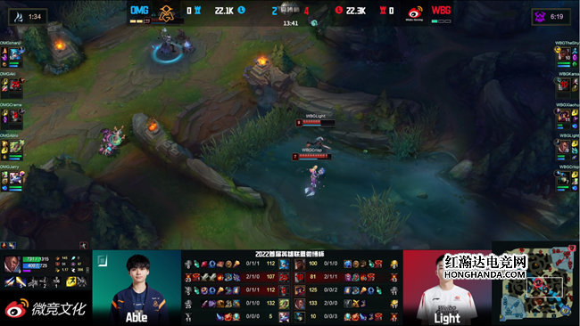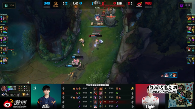 2022英雄联盟微博杯淘汰赛首日,WBG战队以引援之后的全新阵容迎战同样是主力阵容出战的OMG战队,在前两局给Light选出工具人下路的情况下WBG发挥不佳连丢两分站到了悬崖边缘,危急关头Light站了出来用两盘近乎完美的发挥带领队伍扳平比分,最终在决胜局里WBG凭借扎实的前排团战掀翻OMG,完成了让二追三成功晋级。
