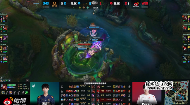 奎桑提和波比肆无忌惮地带领队伍冲阵开战,顶着OMG众人疯狂输出打控制,击溃OMG以后拿下了大龙,接下来WBG又拿下远古龙魂实现三龙会,阿卡丽在中路尝试单杀辛德拉结果惨遭斩杀,WBG打出0换4以后从中路一波平推拆掉基地赢下了比赛,恭喜WBG让二追三战胜OMG晋级淘汰赛第二轮!