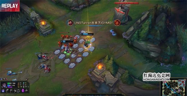 这一场双方的辅助在前期都很活跃,Ke的泰坦先游走了一波中路,帮助中野拿到塞拉斯的一血,随后Hang的塔里克两度gank中路,IGY中野双双倒地,LNG利用中路的线权控下土龙加峡谷先锋。