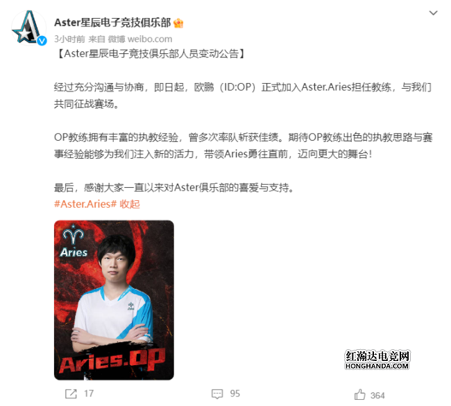 经过充分沟通与协商,即日起,欧鹏(ID:OP)正式加入Aster.Aries担任教练,与我们共同征战赛场。